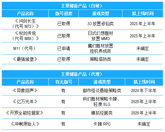 公司储备多款新品,,,期待为玩家解锁更多新鲜体验,,,,部分产品如下表所示:::